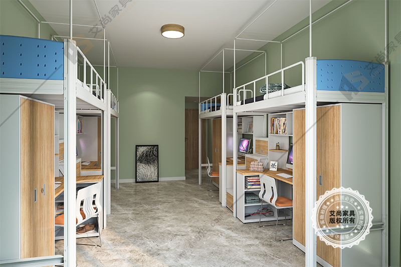 大學(xué)是宿舍生活是非常愜意,舒適的。躺在床上暢談理想和未來。和室友一起嬉鬧。這是一款比較常見的上面是床下面是桌子和衣柜,非常的人性化。這樣我們就能夠?qū)⒁路㈦娔X一起放在這里,這個(gè)其實(shí)就是連體公寓床。