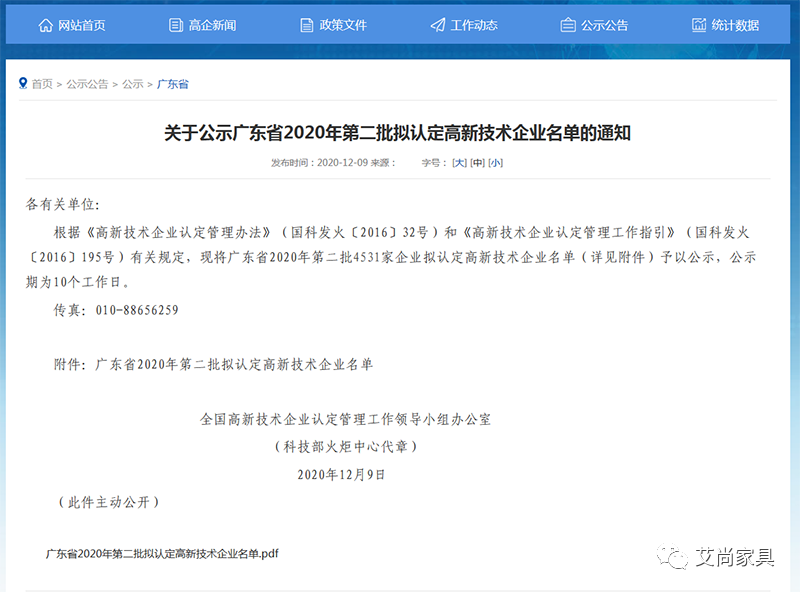 12月9日,在高新技術企業認定官網發布的“廣東省2020年第二批擬認定高新技術企業”名單中,廣東艾尚家具有限公司(以下簡稱 艾尚家具)赫然在列,這標志著艾尚家具正式邁入國家高新技術企業的行列。