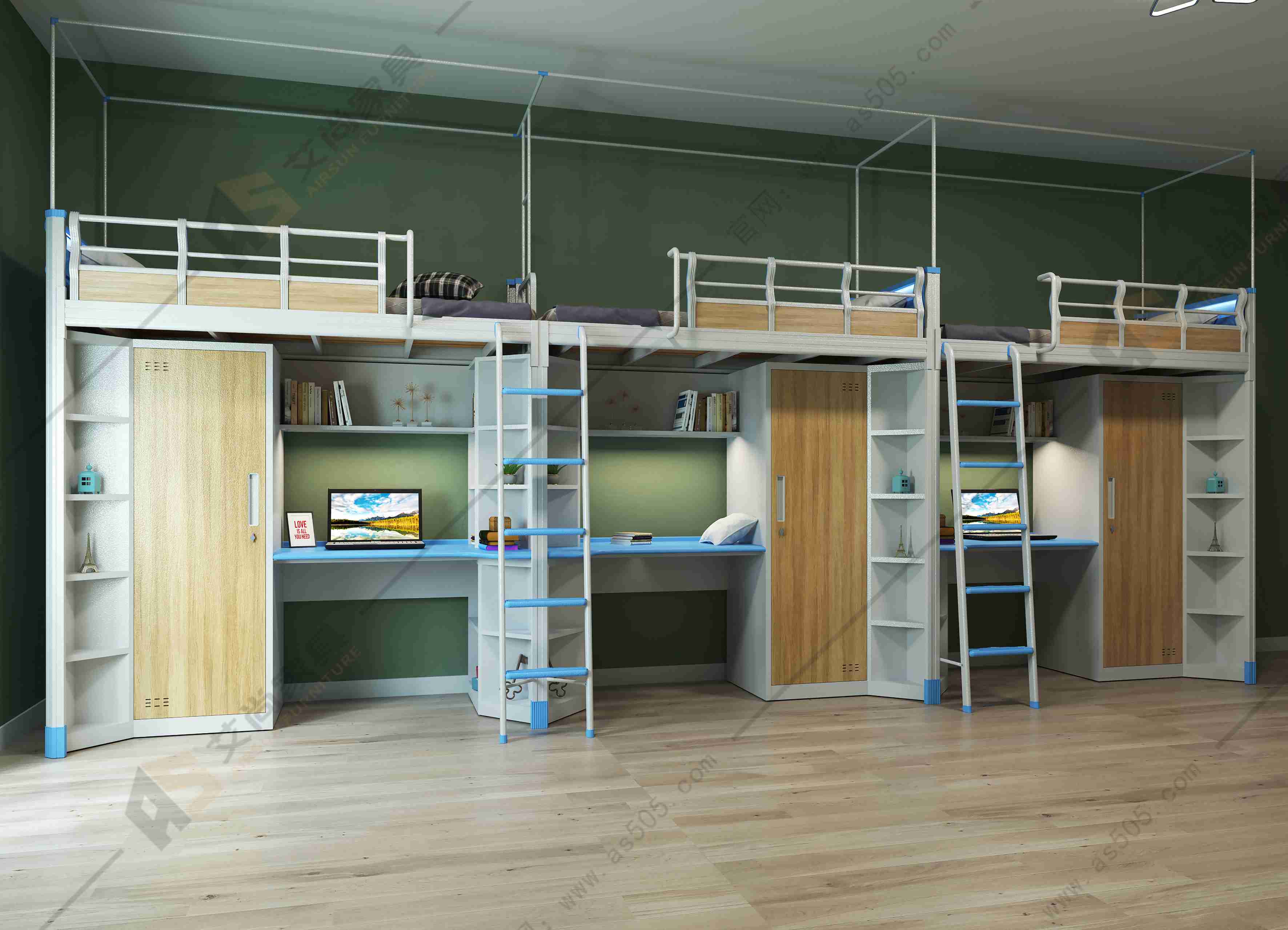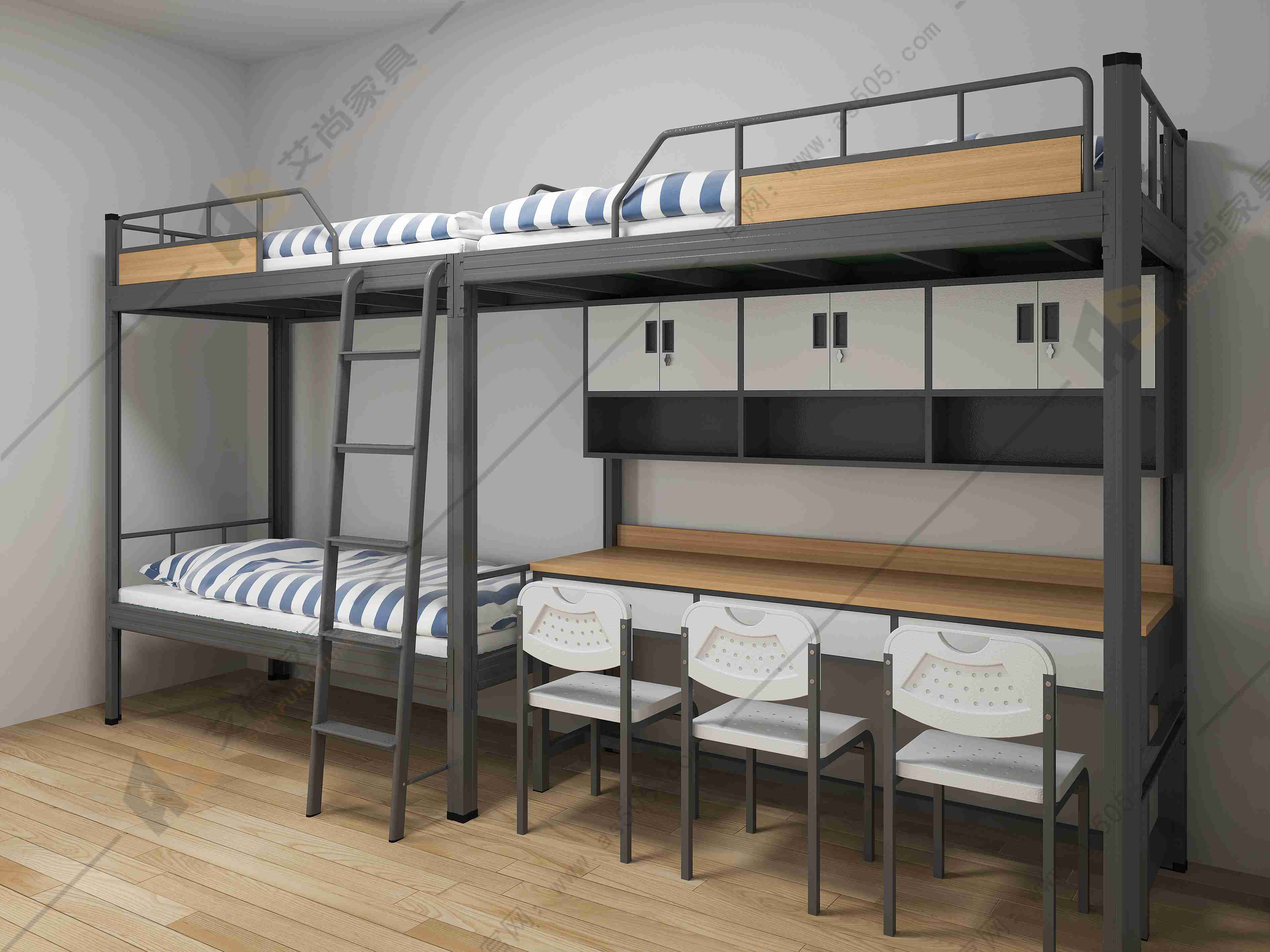 它由床、書柜、衣柜、書桌和梯架組成。書柜和衣柜連接在床架床腿內(nèi)側(cè),書桌將書柜、衣柜連在一起,床架有書柜的一頭安裝有梯架,床架的另一頭與梯架同側(cè)有護(hù)欄,上方睡覺,下方辦公+收納,生活和學(xué)習(xí)分區(qū)。由于床是立體空間組合,不僅節(jié)省了宿舍的空間,而且使宿舍整齊美觀,又便于學(xué)校的管理。
