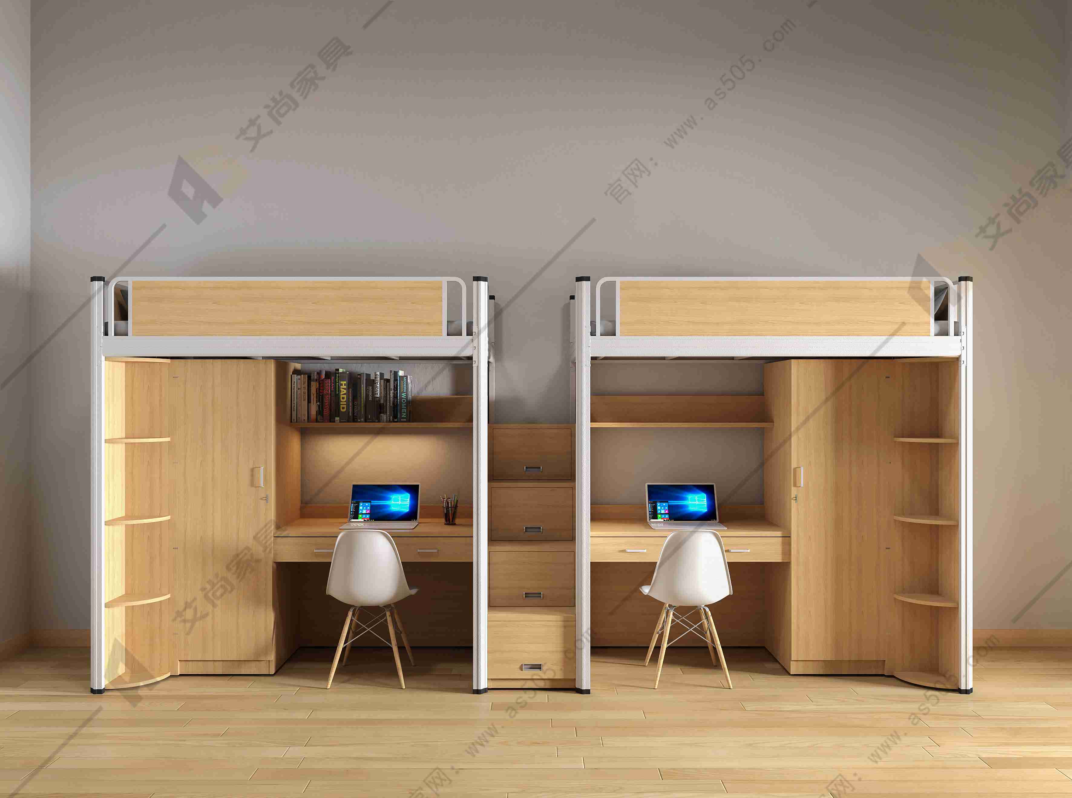 公寓床的書桌和書柜不但滿足了學生日常學習、休閑的生活,而且可以擺放各類書籍 、植物盆栽等物品,衣櫥的分區設計,讓空間利用做到整齊有序。