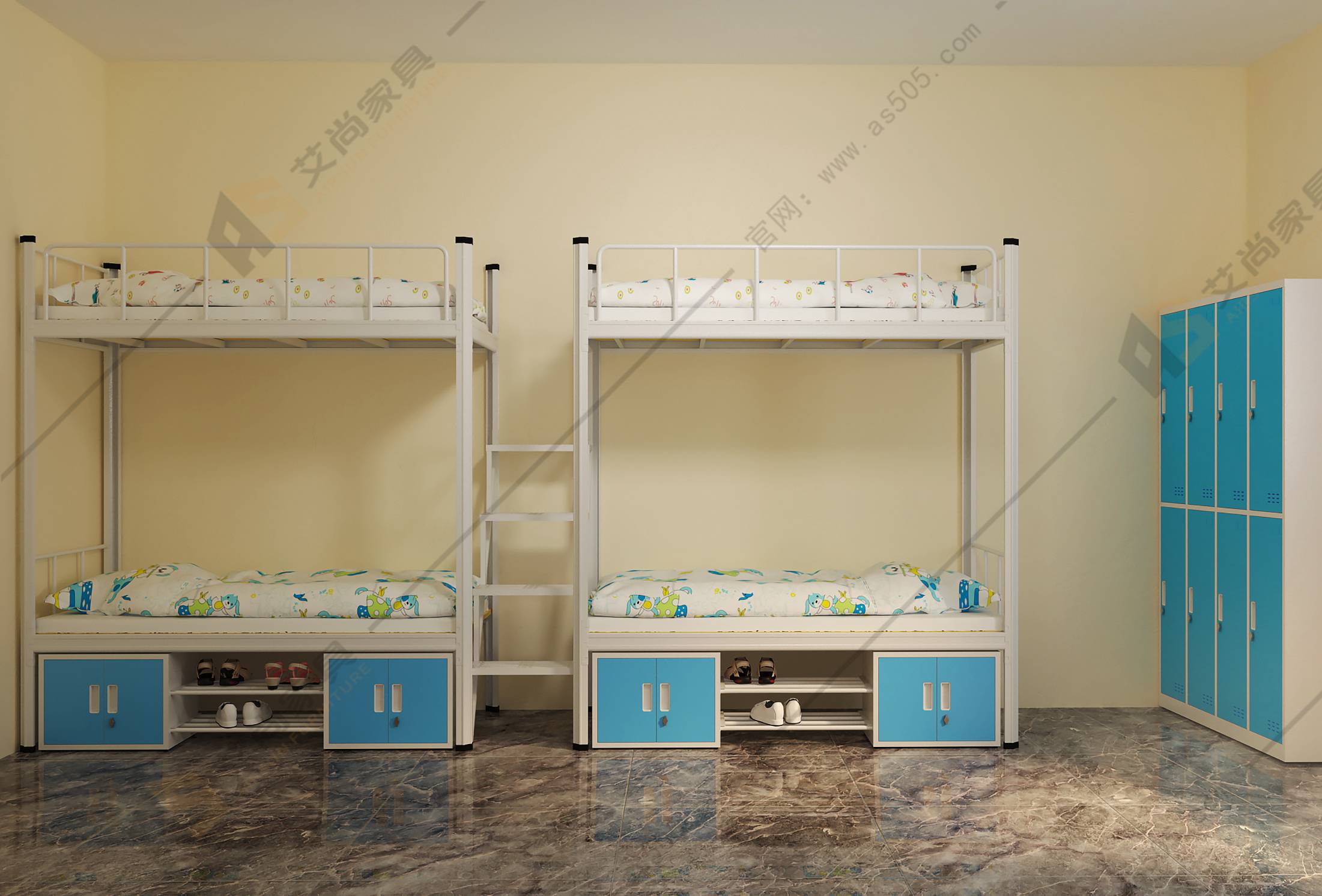上下鋪雙層床根據材質分為鋼制上下床和實木上下床,建議選購鋼制上下床,可以防潮防銹,更加環保,而且功能的可選擇性更豐富,比如床下增加鞋柜,能存放鞋子,方便出入使用。艾尚家具款式多樣,可以選擇全鋼的,衣柜,書桌都是鋼制的;也可以選擇鋼木結合的,看客戶需求。