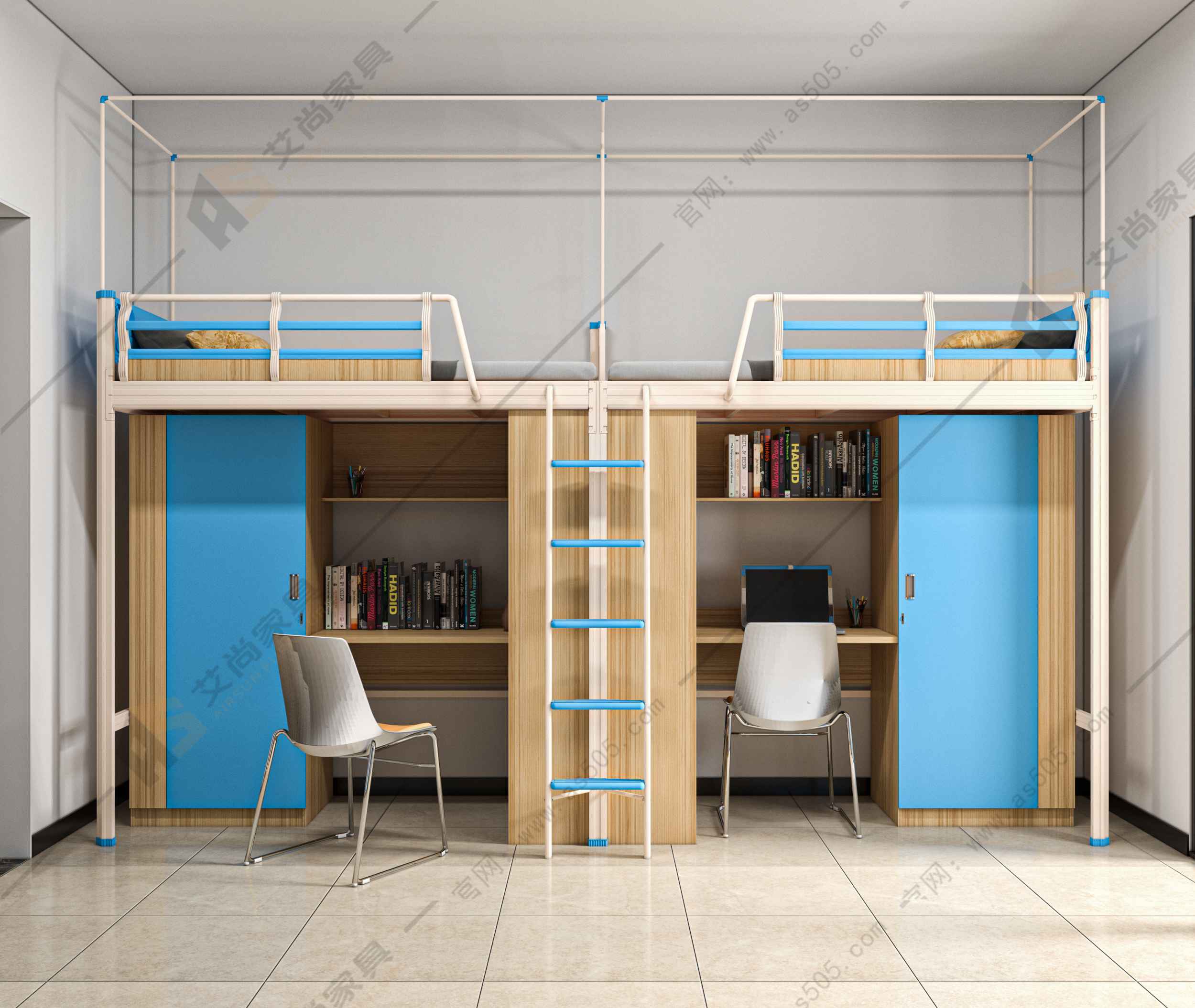 艾尚宿舍兩連體爬梯公寓床的外形尺寸是3930*900*2080mm,是由床、書柜、衣柜、書桌和梯架組成。學校六人間一般是配置三連體爬梯公寓床,外形尺寸為5890*900*2080,因為是生產廠家,尺寸都是可以定制的。