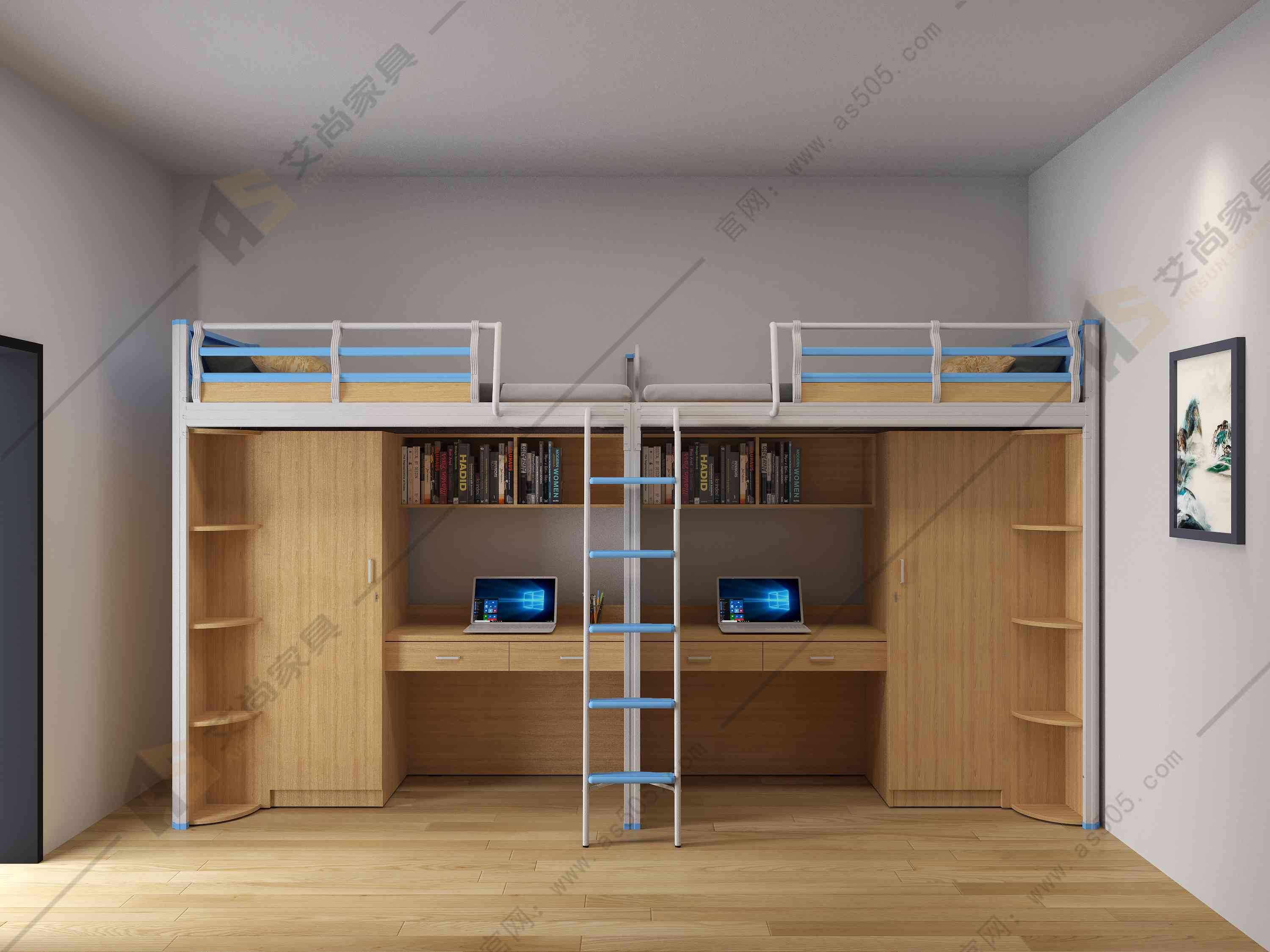 2.雙層床:雙層床是為了節(jié)省空間而設(shè)計(jì)的床型。它具有兩個(gè)床鋪,一個(gè)位于另一個(gè)的上方,通過(guò)梯子或樓梯連接。能夠讓學(xué)生有足夠的活動(dòng)空間,擴(kuò)大利用空間,節(jié)約成本。艾尚還可以選擇定制,讓使用空間更加合理的利用。
