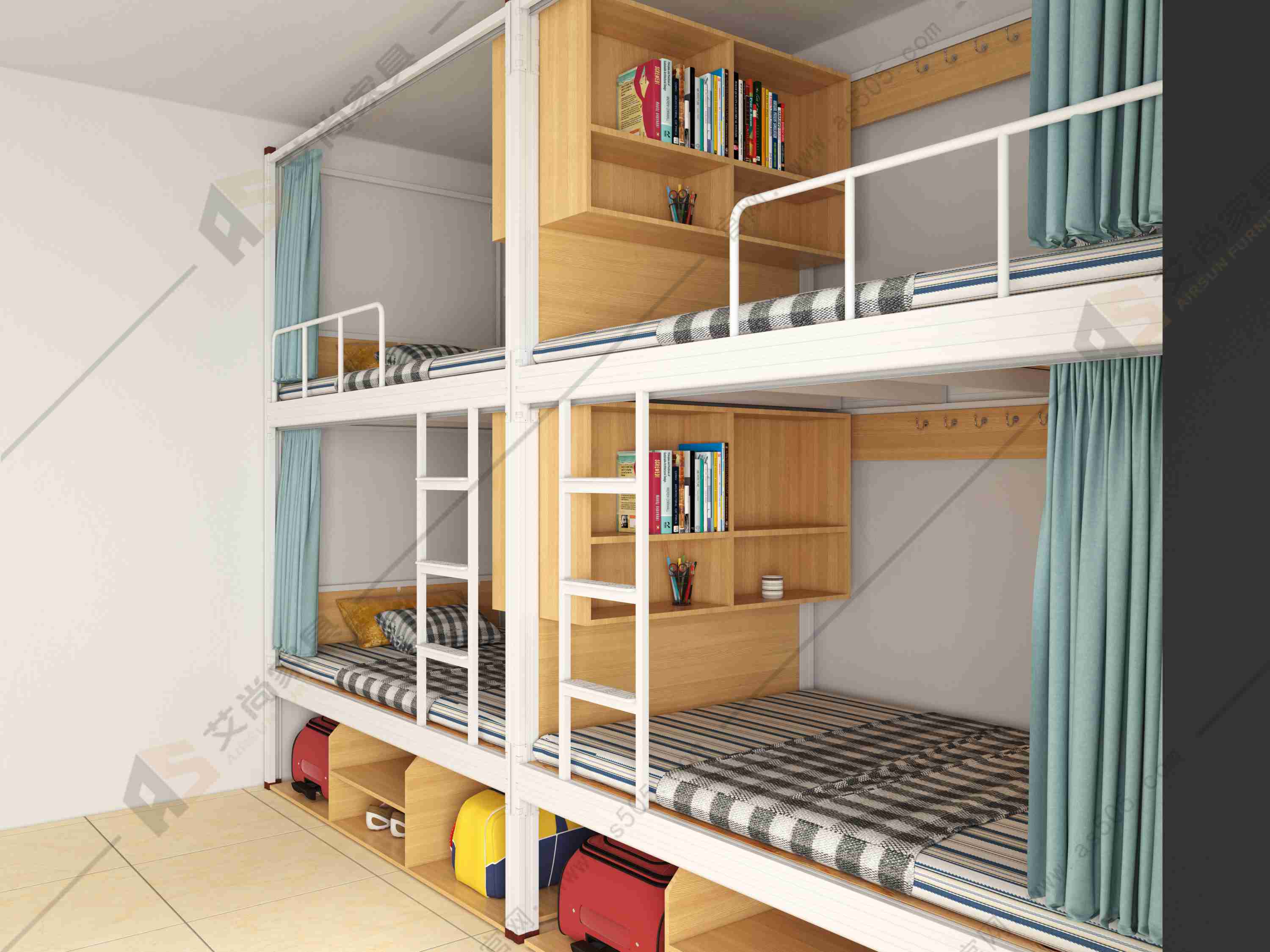 空間利用的最大化:在有限的宿舍空間內(nèi),如何最大化地利用上下鋪結(jié)構(gòu)是關(guān)鍵。設(shè)計(jì)時(shí)合理利用空間增加功能點(diǎn),如儲(chǔ)物柜、書架或?qū)W習(xí)桌等,巧妙地融入床體結(jié)構(gòu)中,既滿足了學(xué)生的儲(chǔ)物和學(xué)習(xí)需求,又節(jié)省了空間。同時(shí),上下鋪之間的空間也可以充分利用,設(shè)置掛衣桿、儲(chǔ)物籃等,方便學(xué)生放置衣物和日常用品。