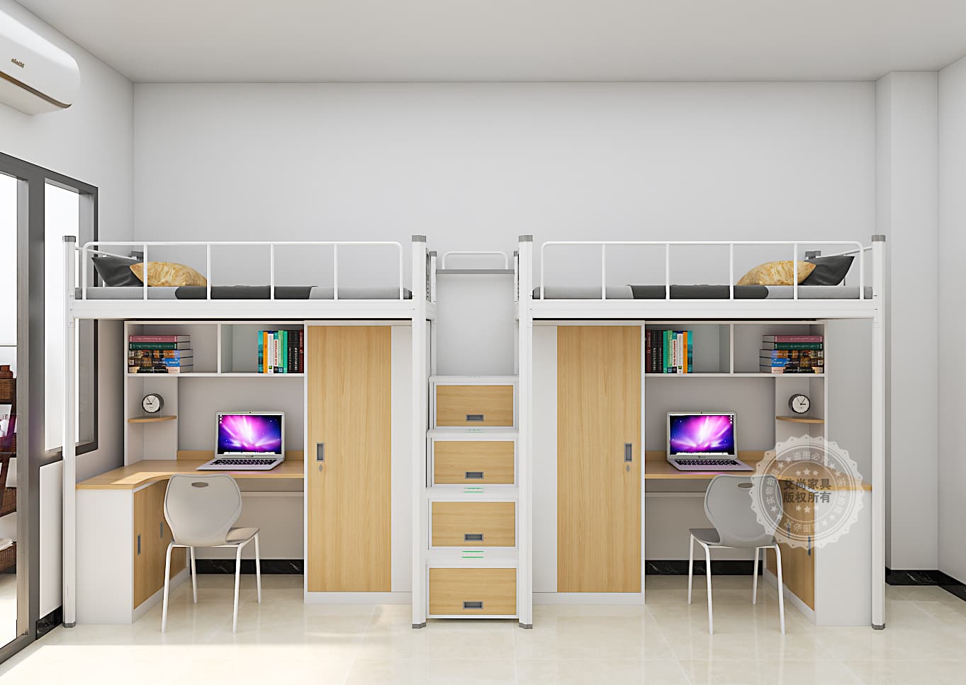 功能集成: 現(xiàn)代宿舍床常與書桌、衣柜、書架、抽屜、梯柜等巧妙結合,極大提升了空間利用率。梯子的設計也融入考量,有的采用腳踏板更寬的傾斜梯柜,有的則設計成樓梯式抽屜,既安全又增加收納。