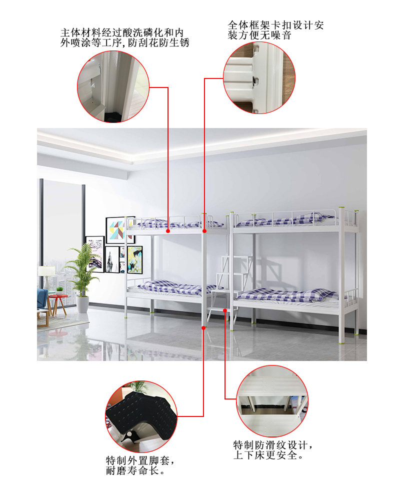 上下鋪鐵床表面全自動噴粉處理,0甲醛;中空異型結構,卡扣式連接、無螺絲;100%冷軋鋼板不參假。真正的良心企業!