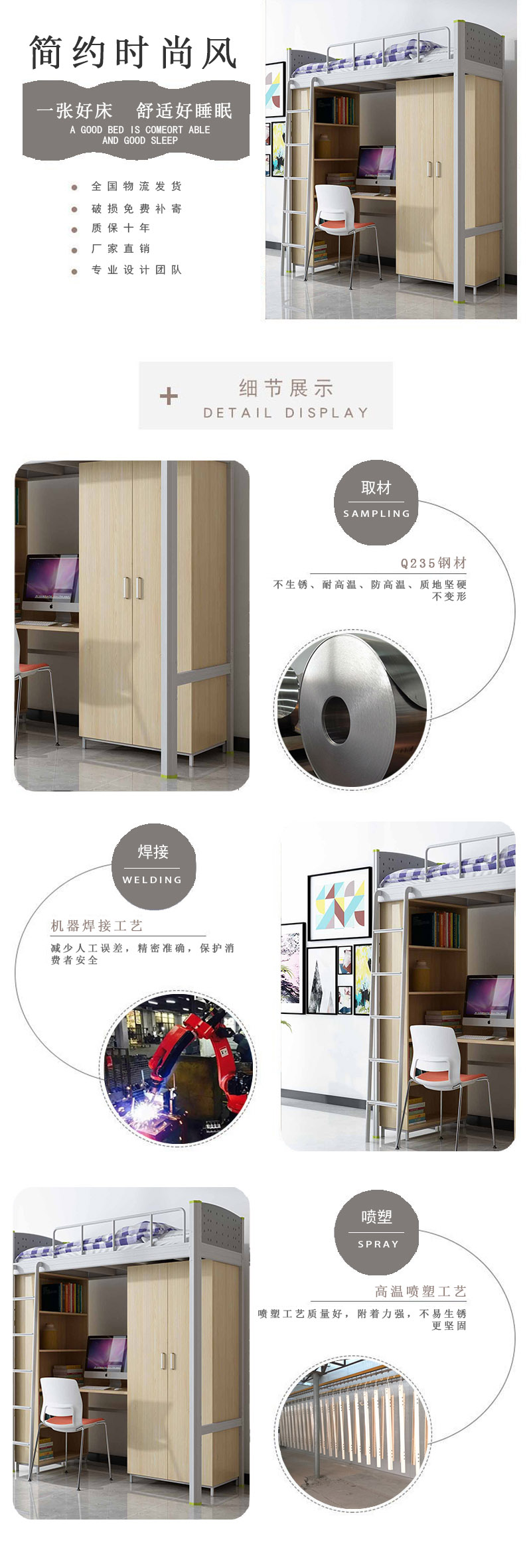 公寓床學生床立柱采用冷軋鋼板,厚度1.2mm。所有連接件采用卡扣式連接,床架采用優質碳鋼制作床架結構穩固,