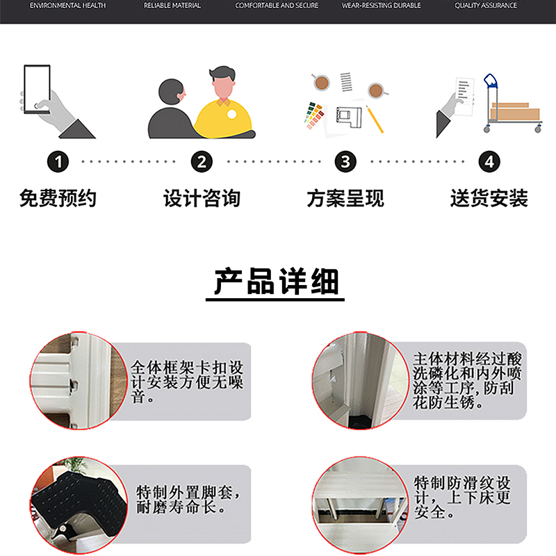 所有產品表面經磷化、酸洗、防腐、防銹、靜電噴塑等化學處理,產品達到 國家環保監測標準,光滑耐磨!